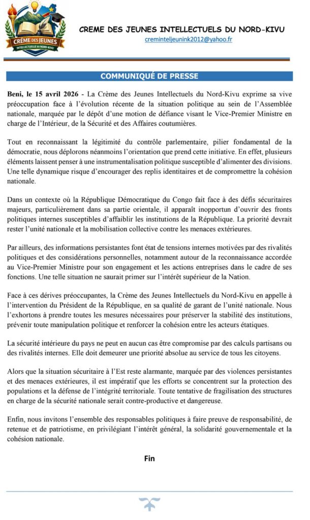 À Beni, la Crème des Jeunes Intellectuels du Nord-Kivu a exprimé, dans un communiqué rendu public ce 15 avril 2026, sa vive préoccupation face à l’évolution récente de la situation politique à l’Assemblée nationale, marquée par le dépôt d’une motion de défiance visant le Vice-Premier ministre en charge de l’Intérieur, de la Sécurité et des Affaires coutumières, Jacquemain Shabani Lukoo.